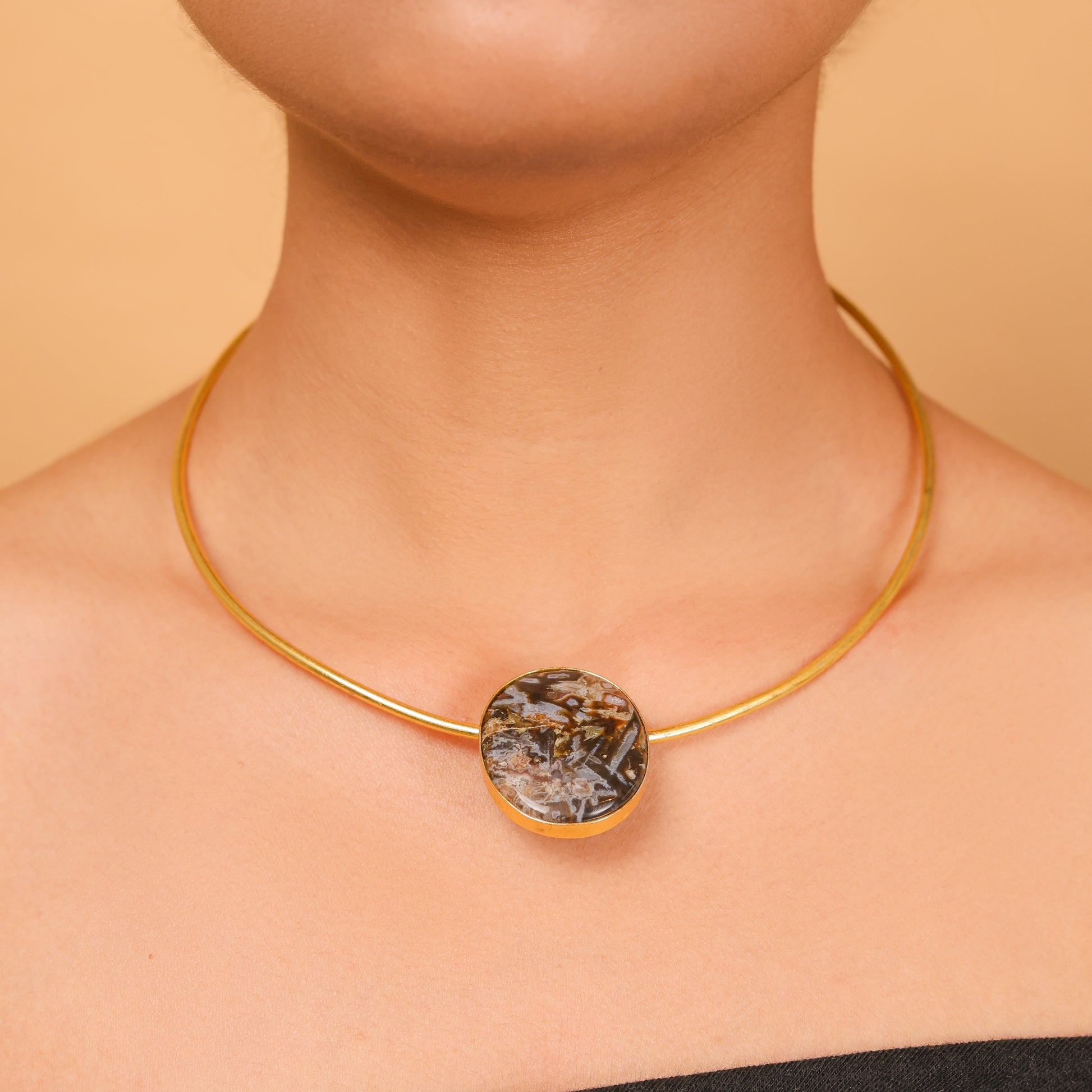Infuse your look with timeless elegance with our Classic Aura Oval Stone Hasli – a striking blend of traditional design and modern grace. Featuring a vibrant green oval stone set in polished brass, this necklace offers a refined statement that complements both ethnic and fusion wear.