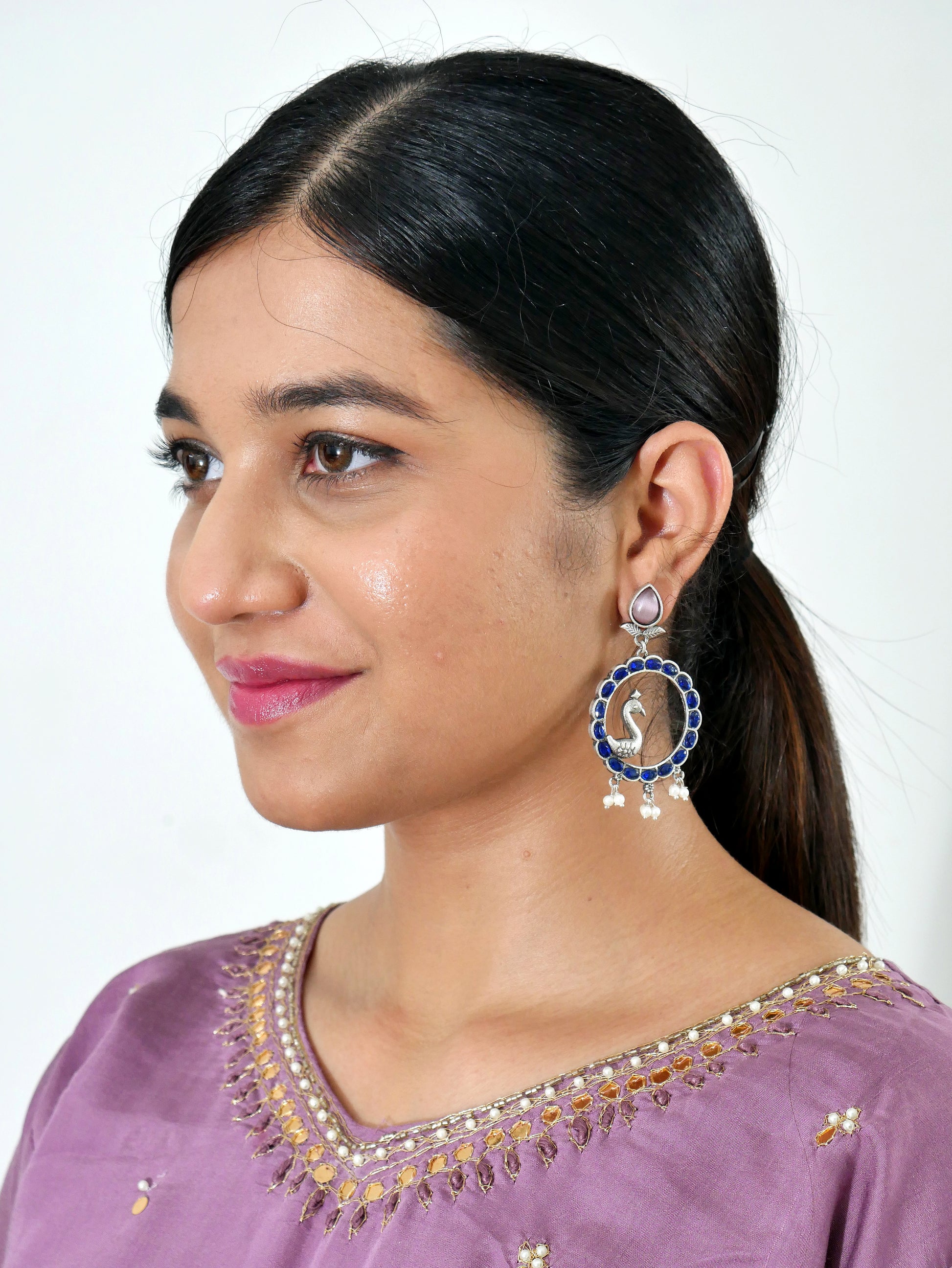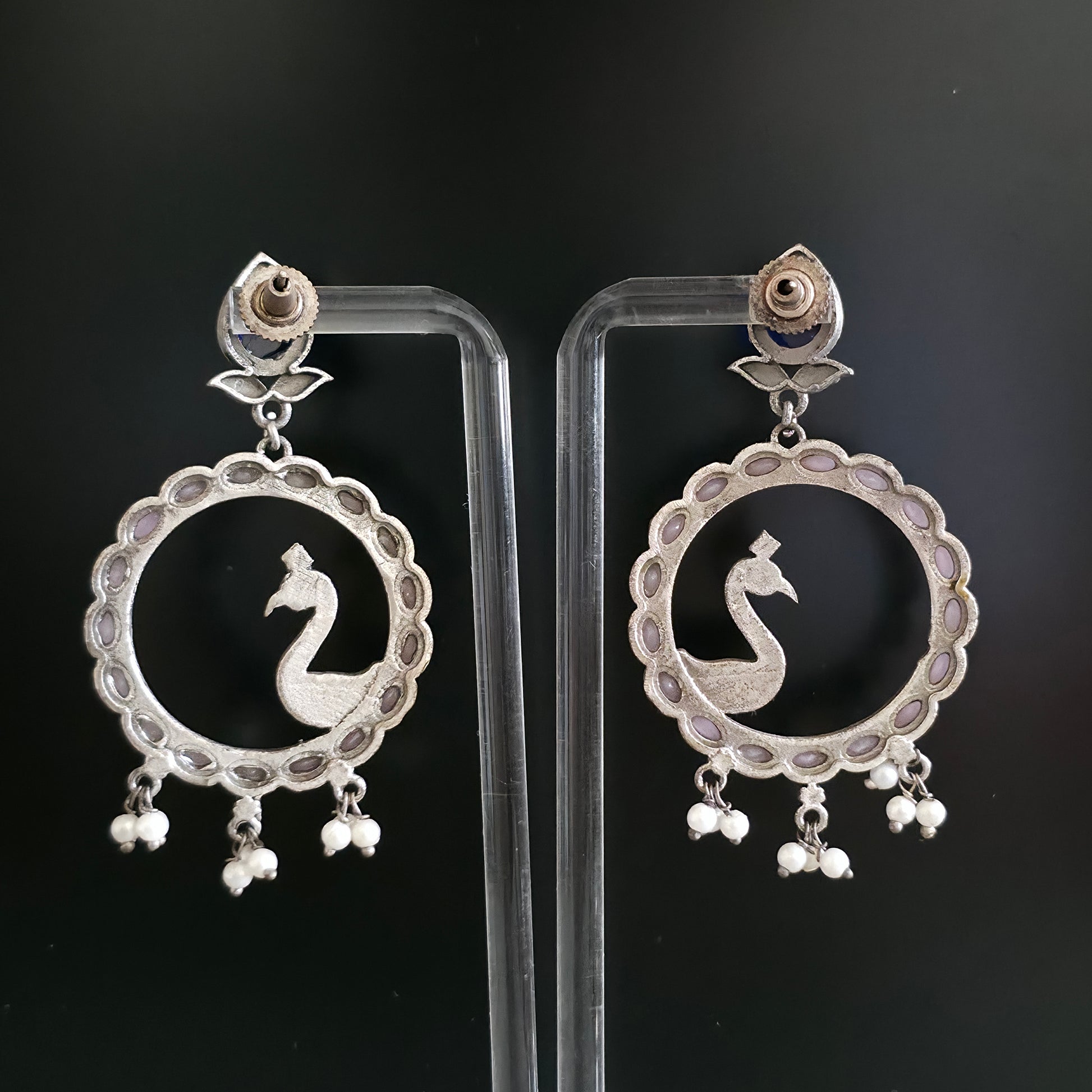 Exquisitely crafted with timeless elegance, the Peacock Elegance earrings pay homage to traditional artistry and refined beauty. Made from premium silver oxidised metal, these earrings showcase a delicate peacock design finished in a rich, antique silver tone—perfect for weddings, festive celebrations, and special family occasions.