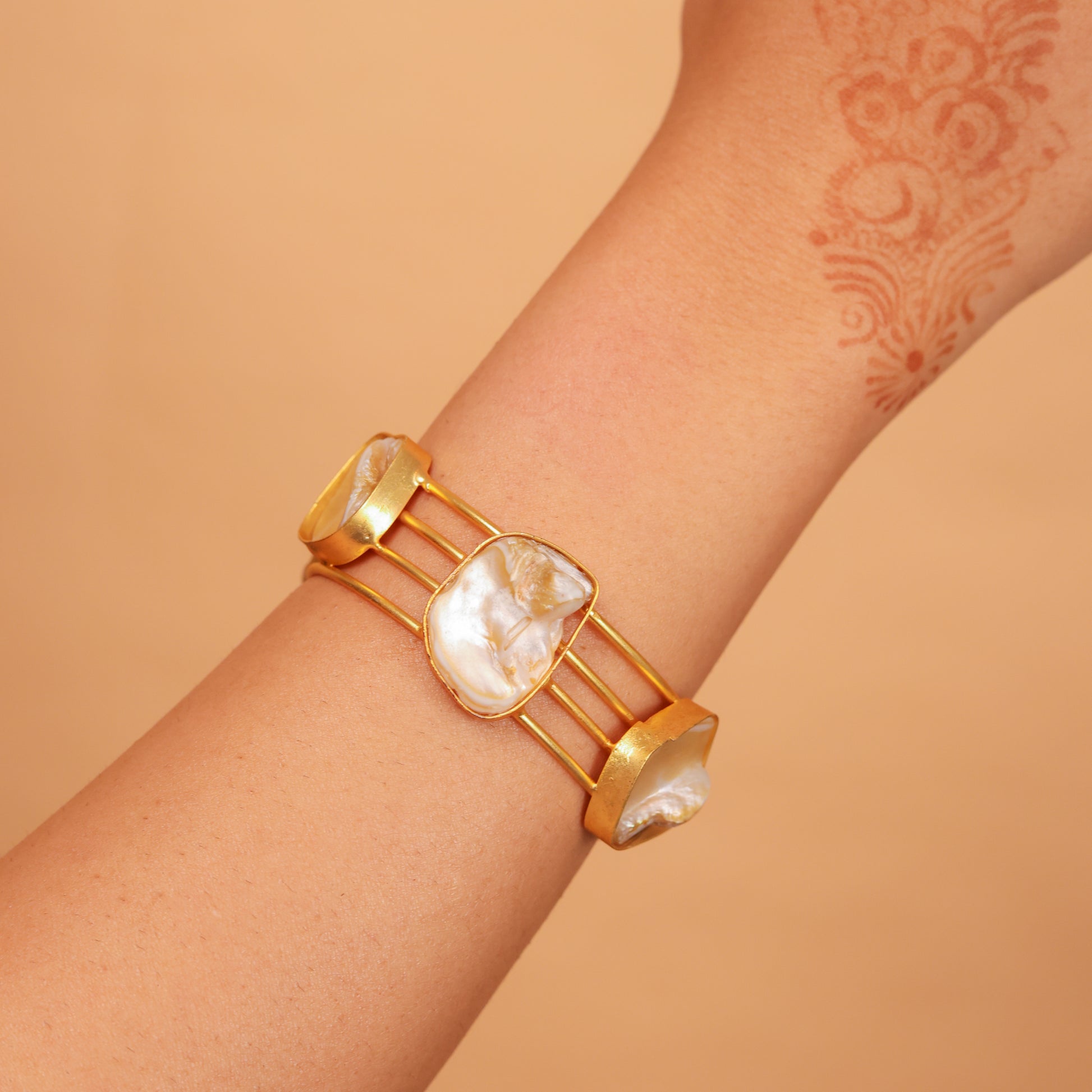 Elevate your accessory game with our Gold Toned Brass Raw MOP Handcuff – a perfect blend of natural beauty and modern design. Featuring raw mother-of-pearl stones set against a warm gold-toned brass band, this bangle adds a subtle shimmer and timeless elegance to any outfit.