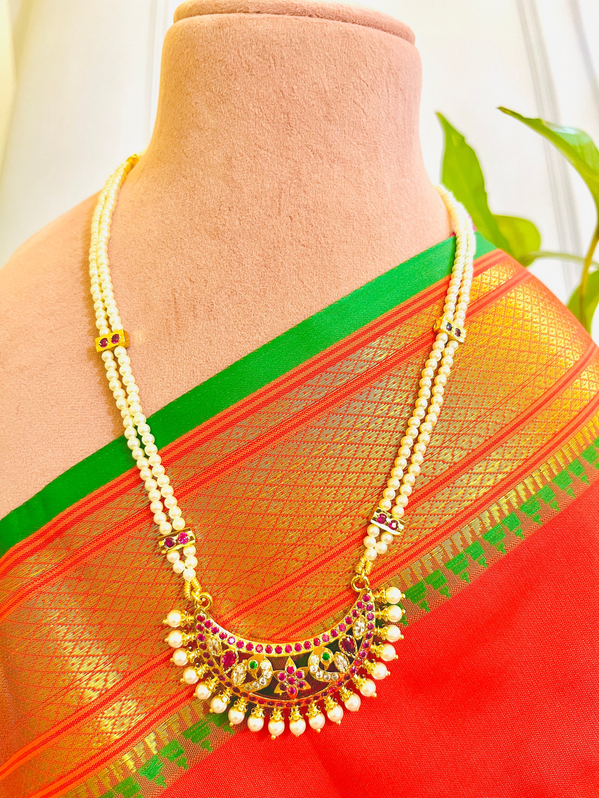 Whether you're dressing up for a wedding, festive occasion, or a traditional family event, this necklace adds an authentic touch to your look. It pairs effortlessly with Paithanis, nauvari sarees, or even contemporary ethnic outfits – making it a versatile addition to your jewelry collection.