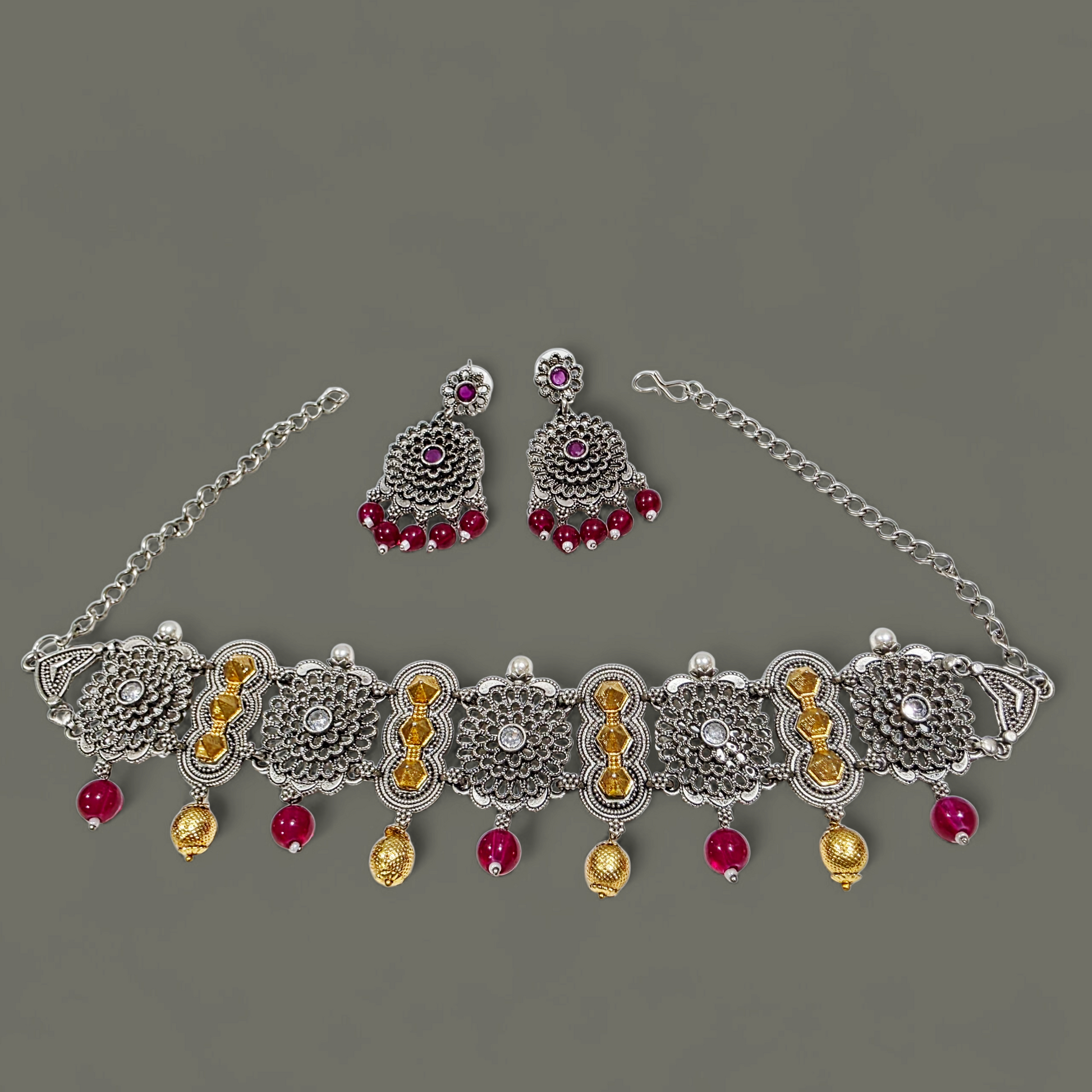 MAROON FOAM FLOWER DUAL TONE OXIDISED SILVER CHOKER SET