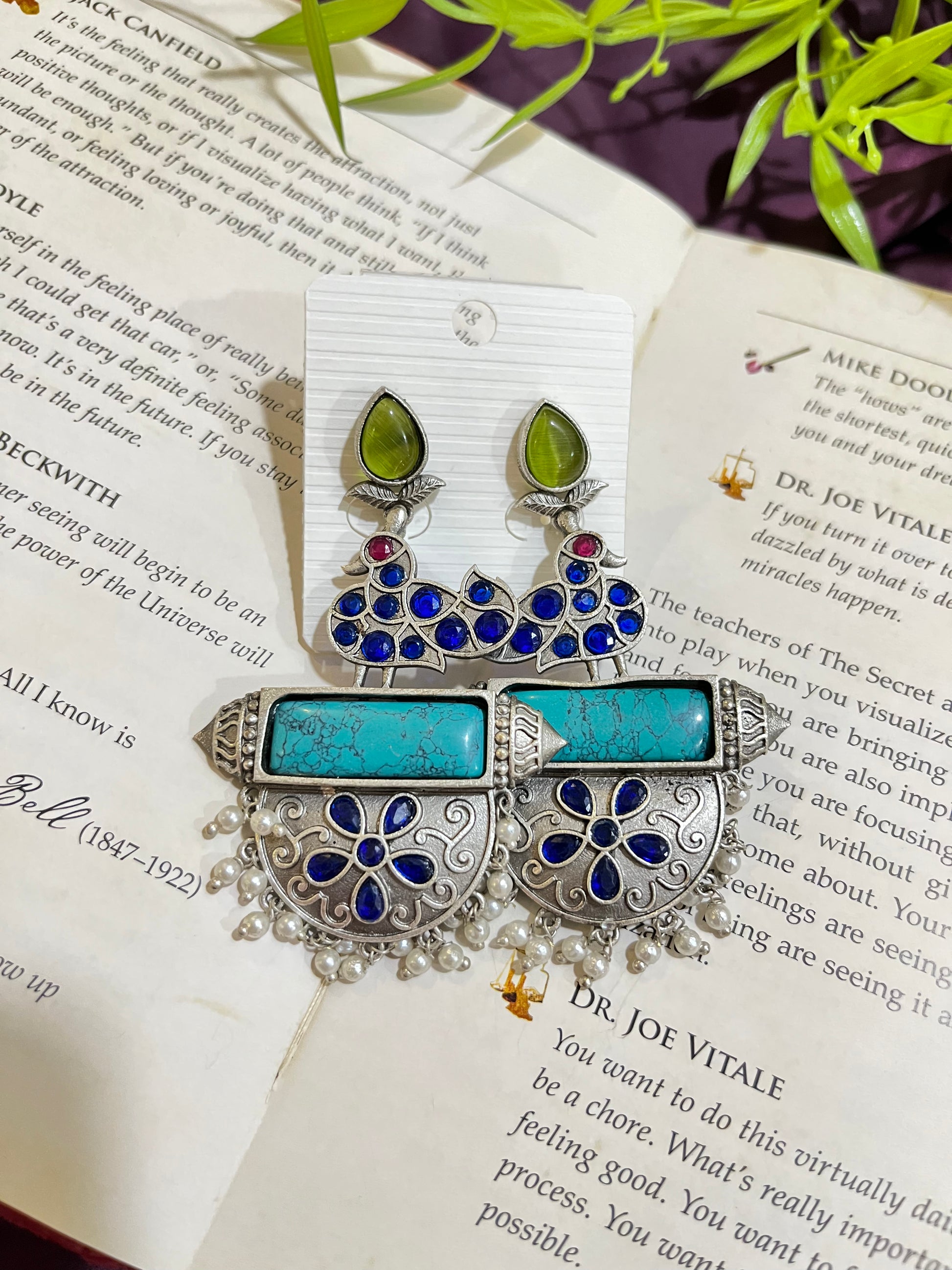 Add a dash of ethnic flair with our Morbaan German Silver Dangler Earrings – featuring enchanting Monalisa stones in vibrant blue and yellow tones, beautifully set against intricate oxidised silver work. These earrings bring a boho-inspired elegance that’s perfect for festive wear or everyday ethnic styling.