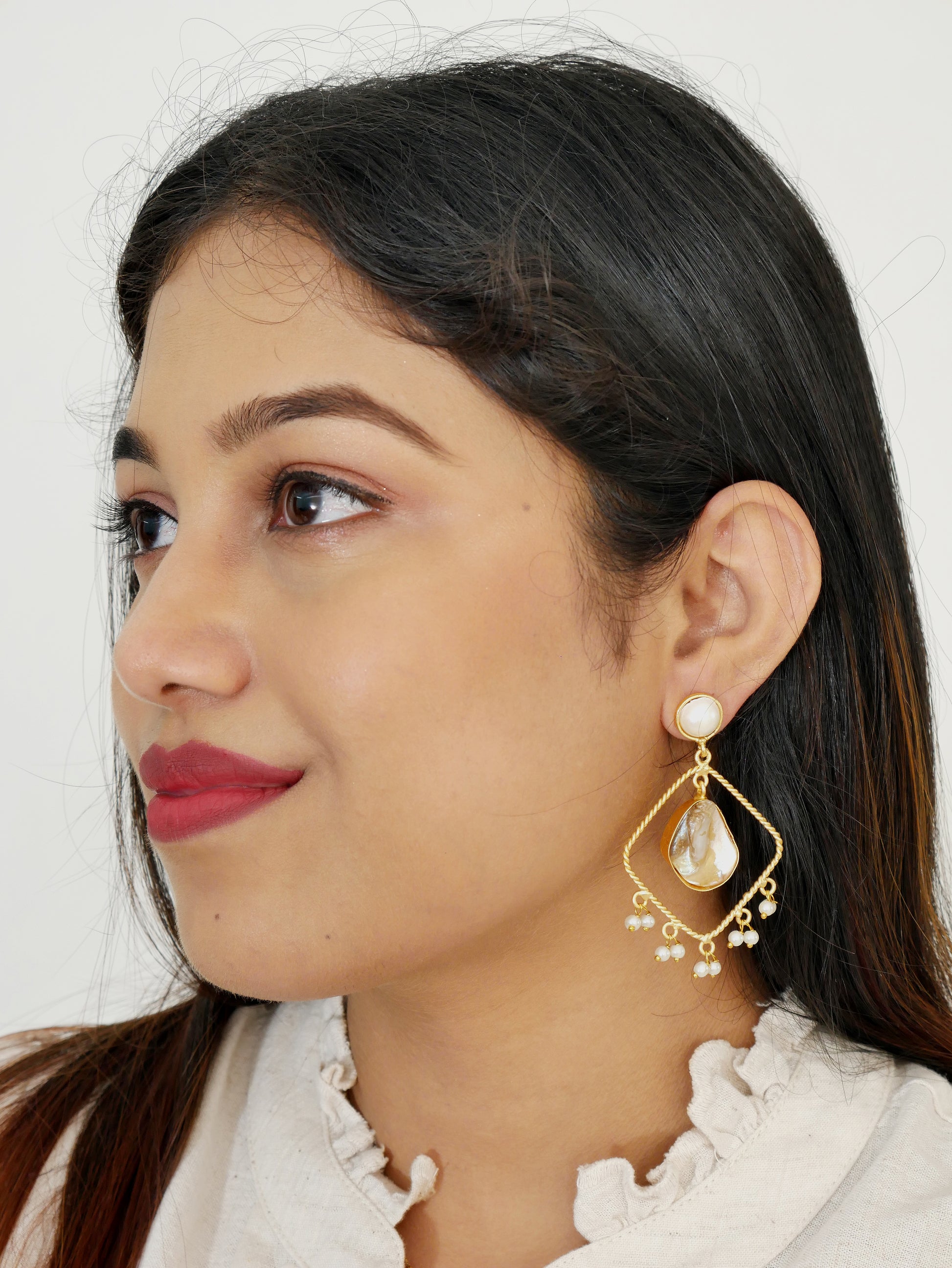 Add a soft, elegant glow to your look with our MOP Golden Brass Pearl Danglers—a delicate blend of minimal charm and statement style. Crafted from high-quality brass and finished with mother-of-pearl detailing, these white danglers bring a fresh, refined touch to both ethnic and modern outfits.