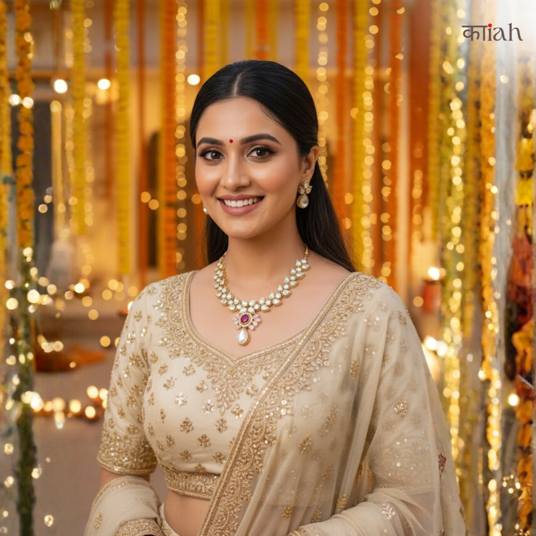 Radiate timeless elegance with this stunning Red Ruby Kundan Necklace Set. Handcrafted with intricate Kundan detailing and deep ruby-red stones, this set exudes royal charm and sophistication. Perfect for weddings, festive occasions, or traditional celebrations, it beautifully complements both sarees and lehengas. Comes with matching earrings to complete the regal look.