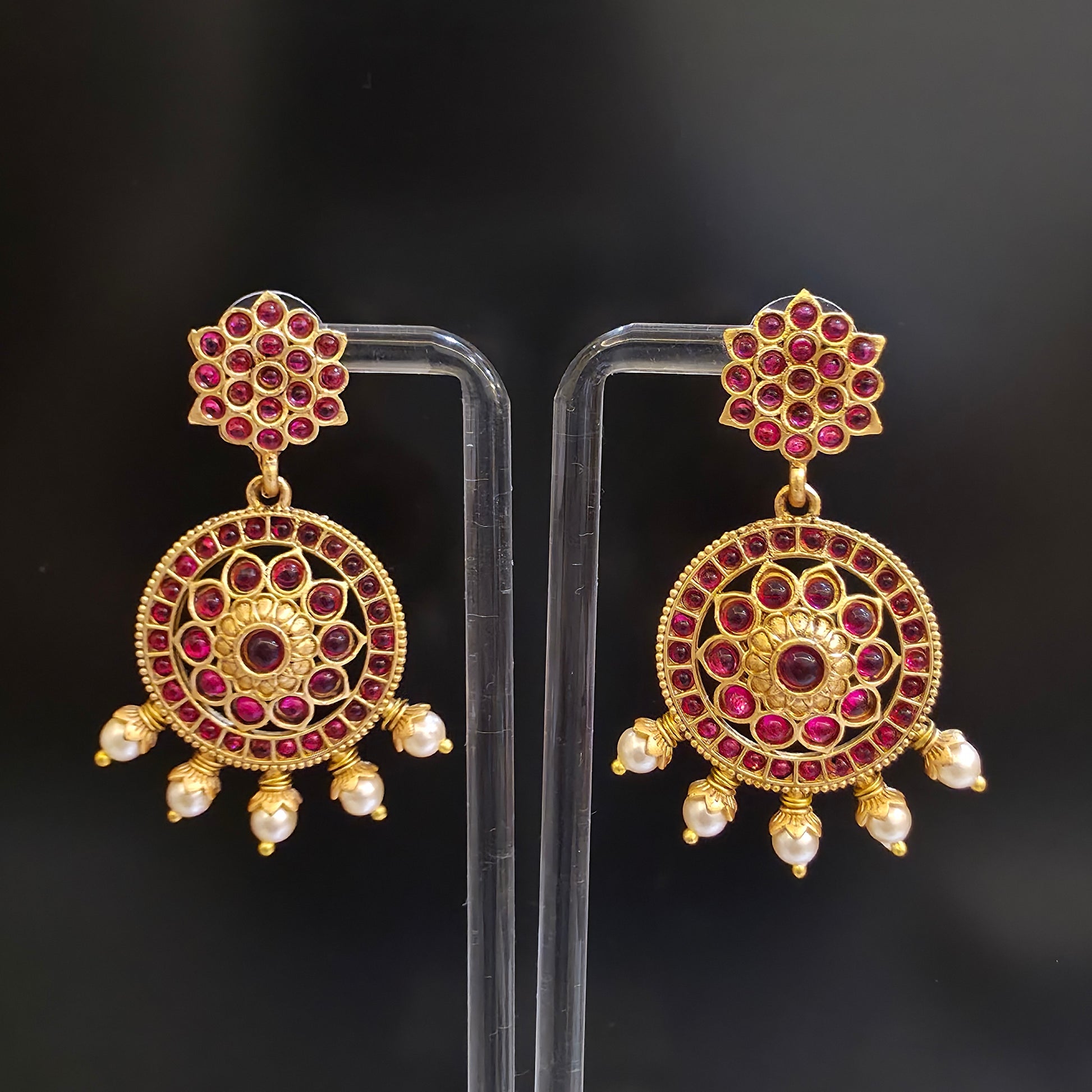 Grace your look with these stunning temple-style earrings, adorned with vibrant ruby-red stones and intricate circular motifs. Accented with dangling pearl beads, this pair blends heritage charm with festive elegance — perfect for weddings and traditional occasions.