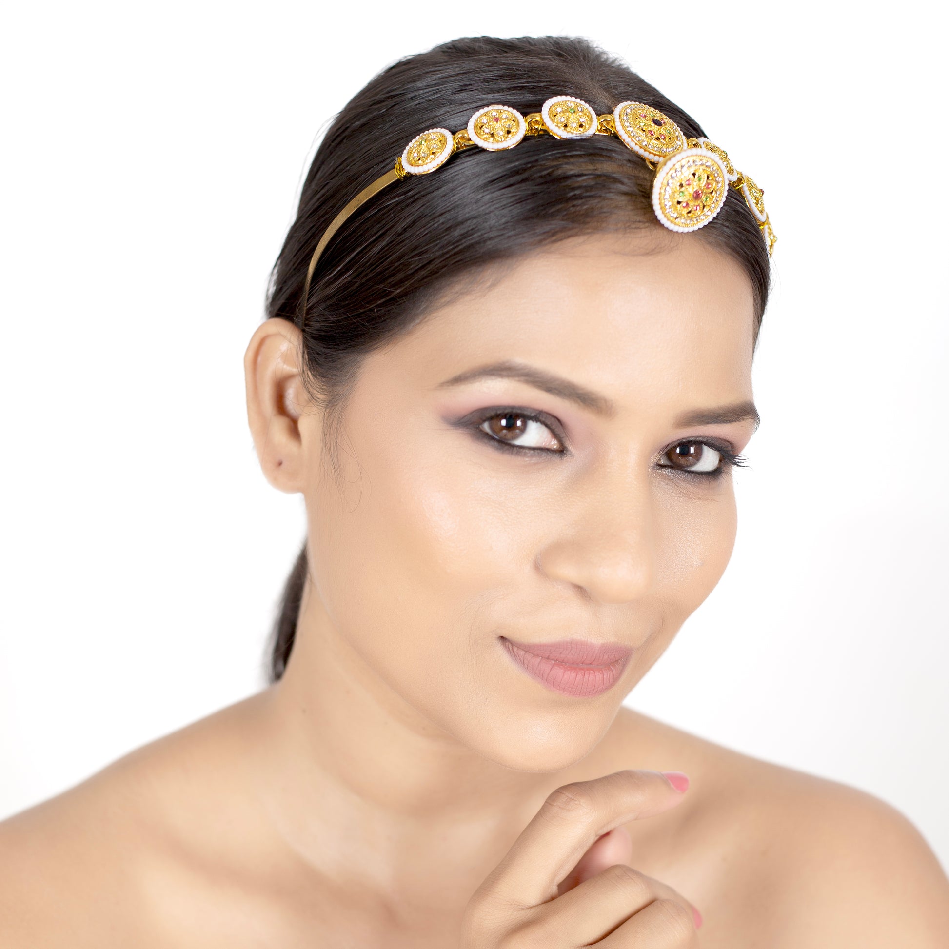 A traditional Rajasthani jewelry accessory, the Matha Patti is a decorative headband adorned with intricate designs and embellishments, worn across the forehead to enhance traditional attire and showcase cultural elegance.