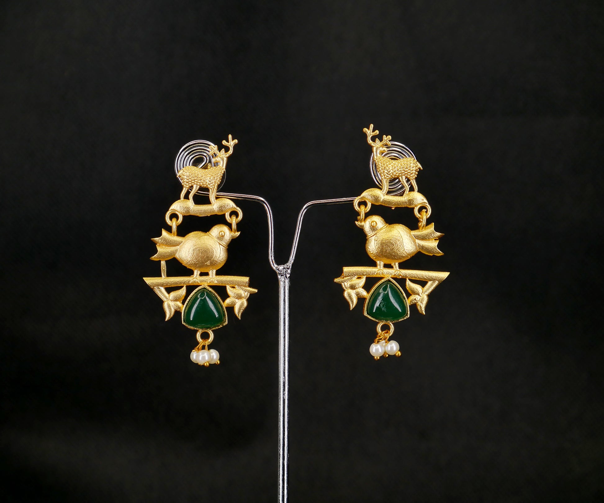 Bring a touch of heritage to your style with our Vanarasa earrings, beautifully crafted in antique golden brass. The deep green accents add a pop of earthy elegance, making this piece both unique and versatile—perfect for festive wear or adding a hint of tradition to your everyday outfits.