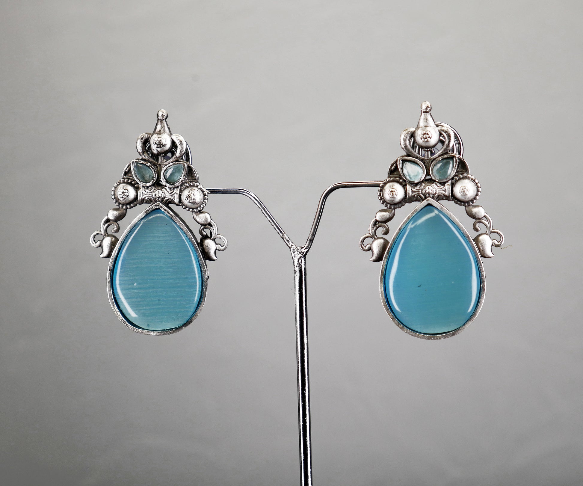 Adorned with striking blue and black Monalisa stones, this elegant Silver Oxidised Earring set is a true masterpiece of craftsmanship and tradition. Perfect for your festive gatherings and special occasions, its bold yet graceful design reflects timeless beauty and refined taste.